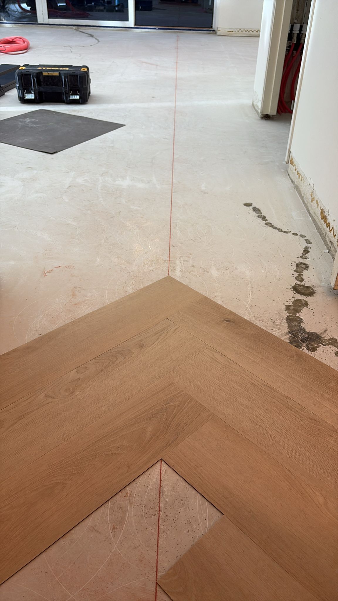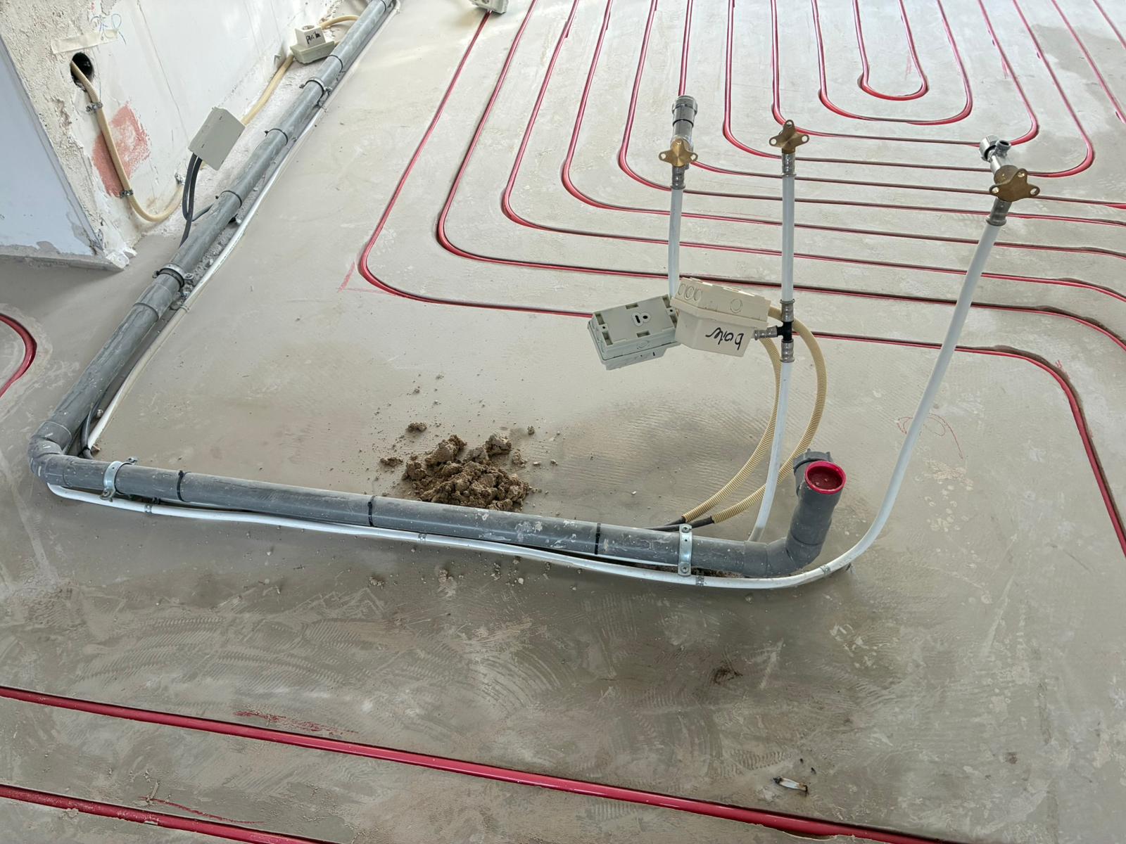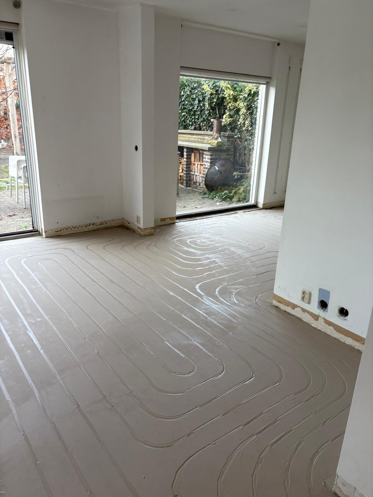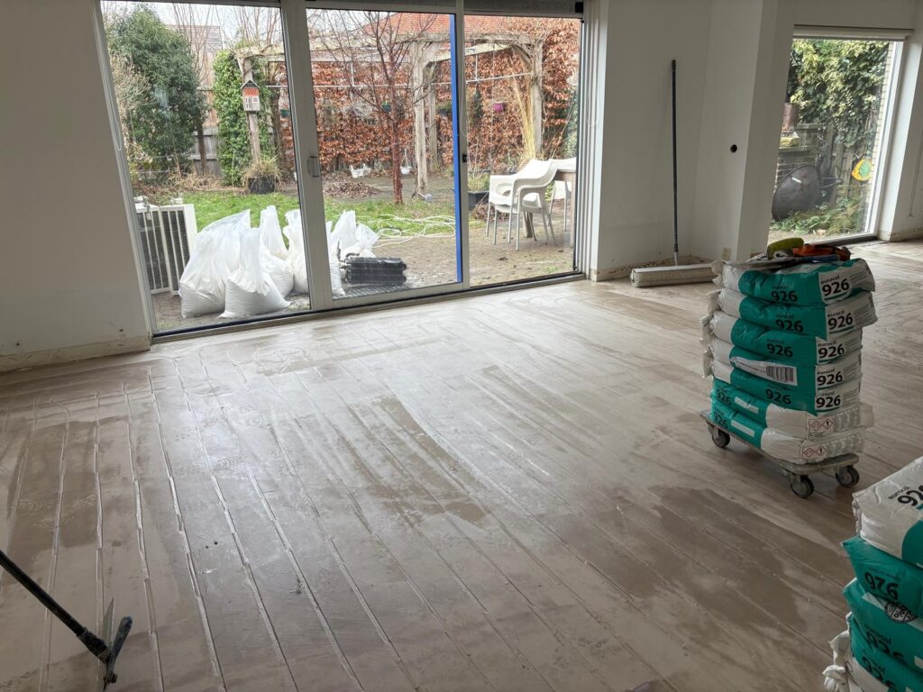 Het project begon met een verrassing: de ondergrond bleek uit meerdere lagen te bestaan. Een houtenvloer, spaanplaten vloer en daaronder een tapijt. De klant en een extern sloopbedrijf hebben de vloeren verwijderd. Wat overbleef was een gietstrijk-achtige ondergrond die in matige staat verkeerde. Hierdoor was de basis niet vlak en niet geschikt voor verdere opbouw. Daarnaast moest er nog vloerverwarming worden aangebracht.