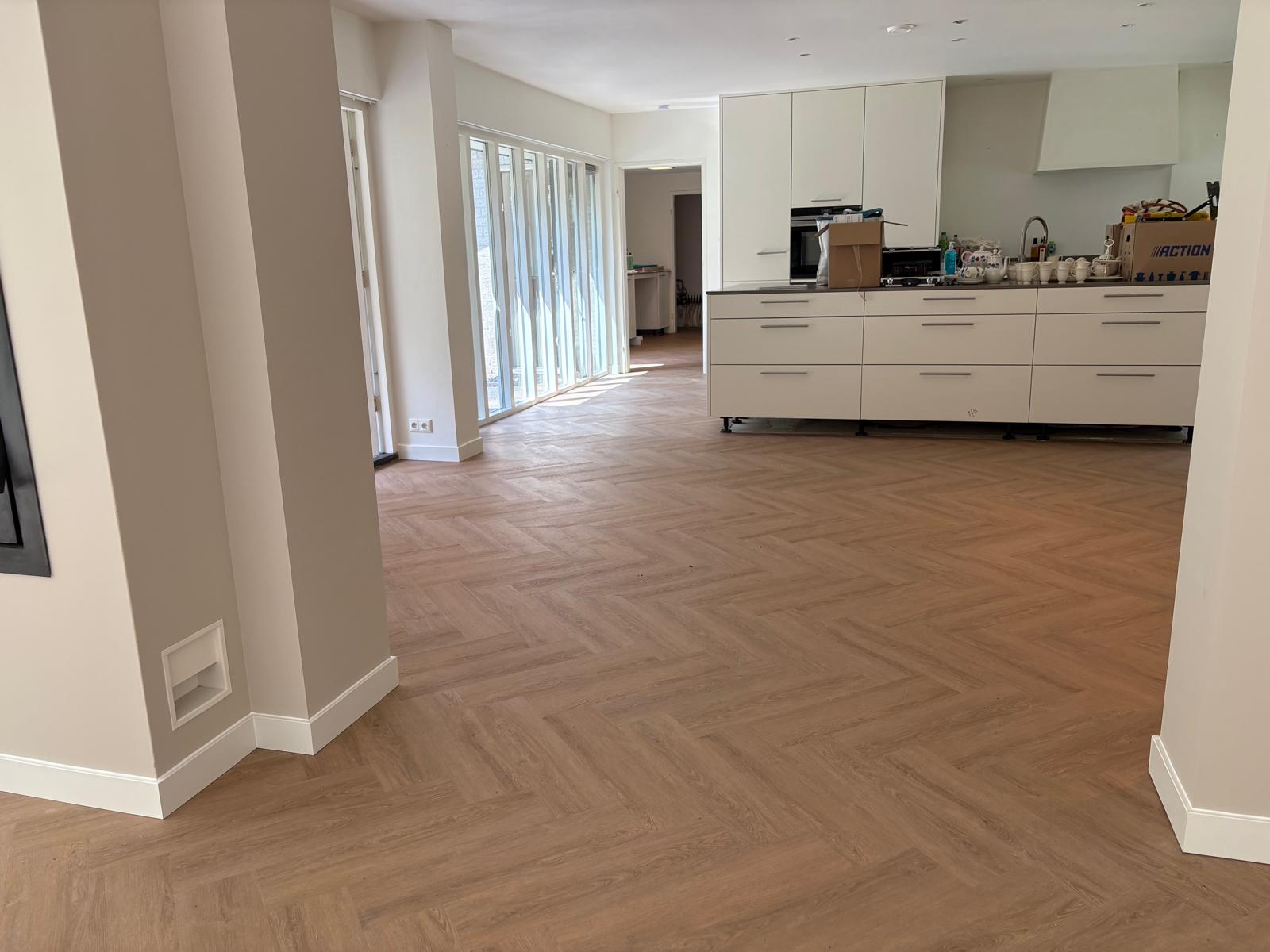 Naast de vloeropbouw verzorgden we ook de afwerking. We leverden en plaatsten visgraat PVC vloer, schoonloopmatten en monteerden moderne MDF plinten van 90 x 12 mm als randafwerking. Het totale project omvatte circa 208 m² (visgraat)vloer.