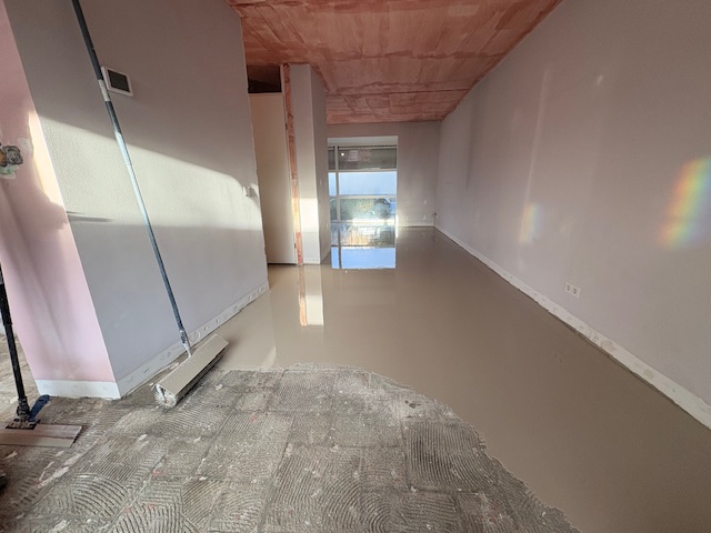 Bij dit project was het nodig om te egaliseren voordat de eindvloer erop geplakt zou worden. Normaal gesproken egaliseren wij nadat de vloerverwarming is ingefreesd. We zagen echter dat de ondergrond dusdanig slecht was, dat ervoor gekozen is om ook vóór het infrezen van de vloerverwarming de vloer egaal te maken.