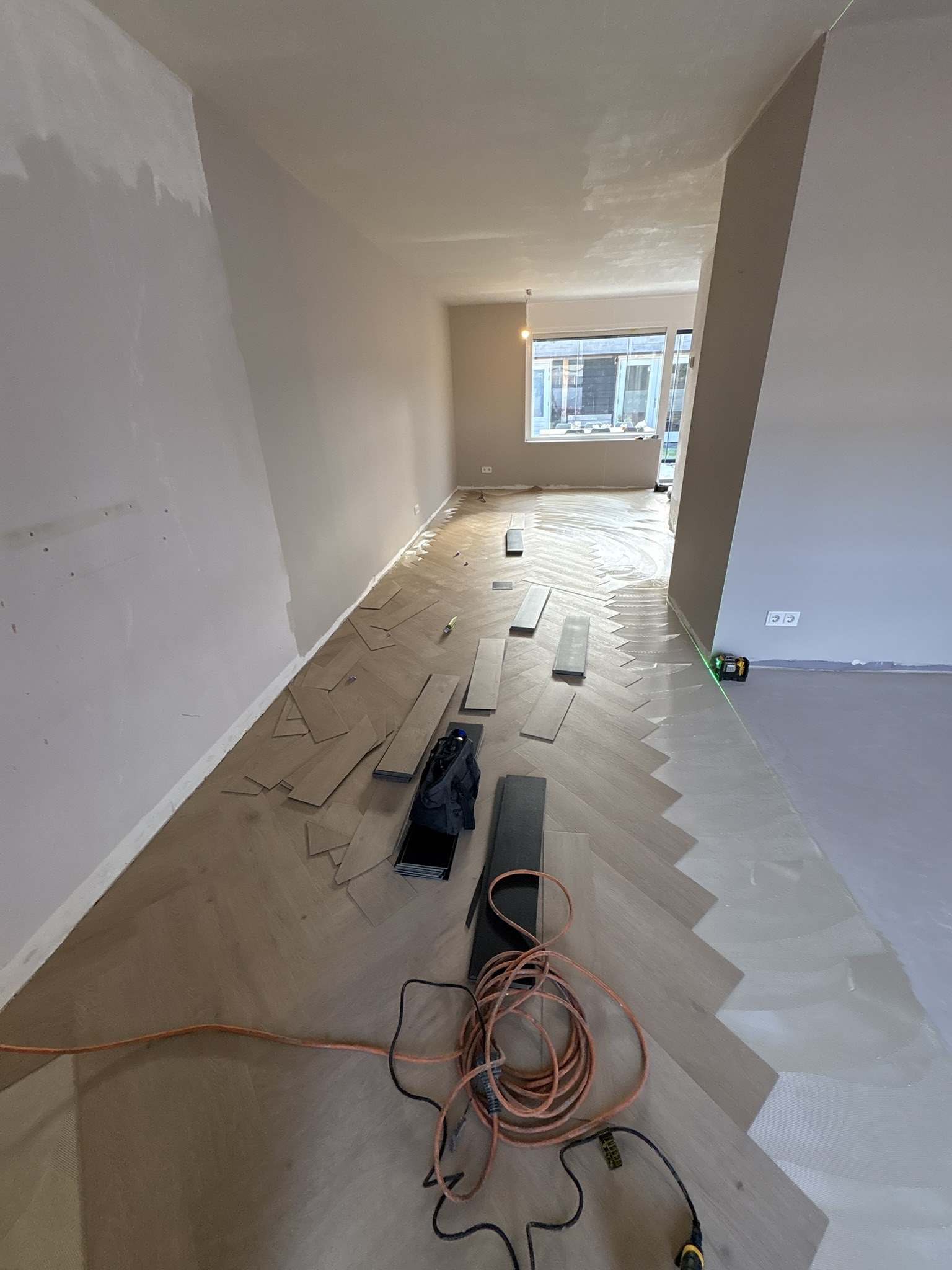 De klant had gekozen voor een visgraat vloer in een mooie, eigentijdse kleur. Het eindresultaat was een totaal andere look in de woonkamer. De klant was er heel tevreden over. Daar doen we het voor!